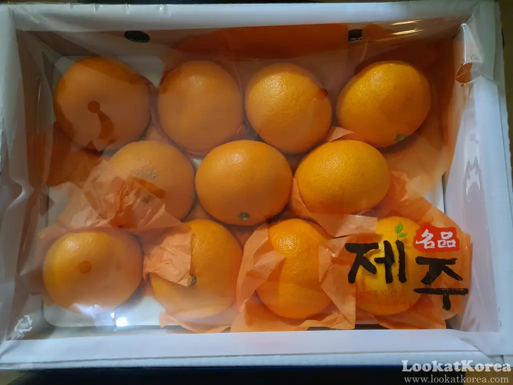 Cheonhyehyang is typically sold in premium gift-style boxes. A 3kg box runs around 30,000 KRW (roughly $22 USD), usually containing about 11 fruits — which works out to approximately 2,800 KRW, or about $2, per fruit. It’s pricier than regular mandarins, but the presentation and quality make it a popular choice for gifting as well.