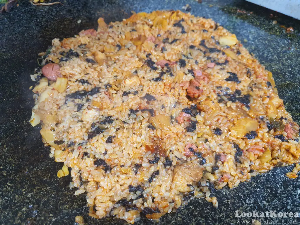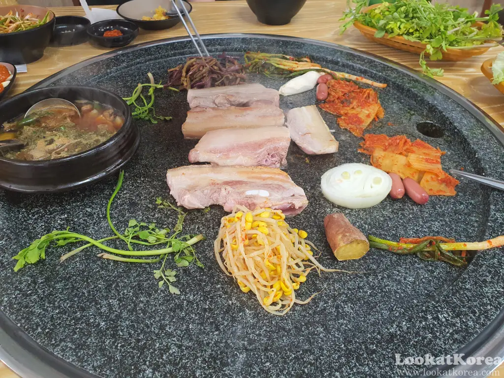 The first thing you’ll notice is the massive stone grill (Dolpan) at each table. It is large enough to cook everything you can imagine all at once.