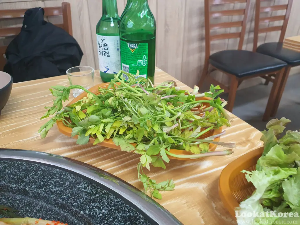 On one side of the hall, there’s a self-service bar—not your typical salad bar, but a station filled with unlimited fresh greens. Since I visited during the spring, the station was packed with fresh Minari (Water Parsley).