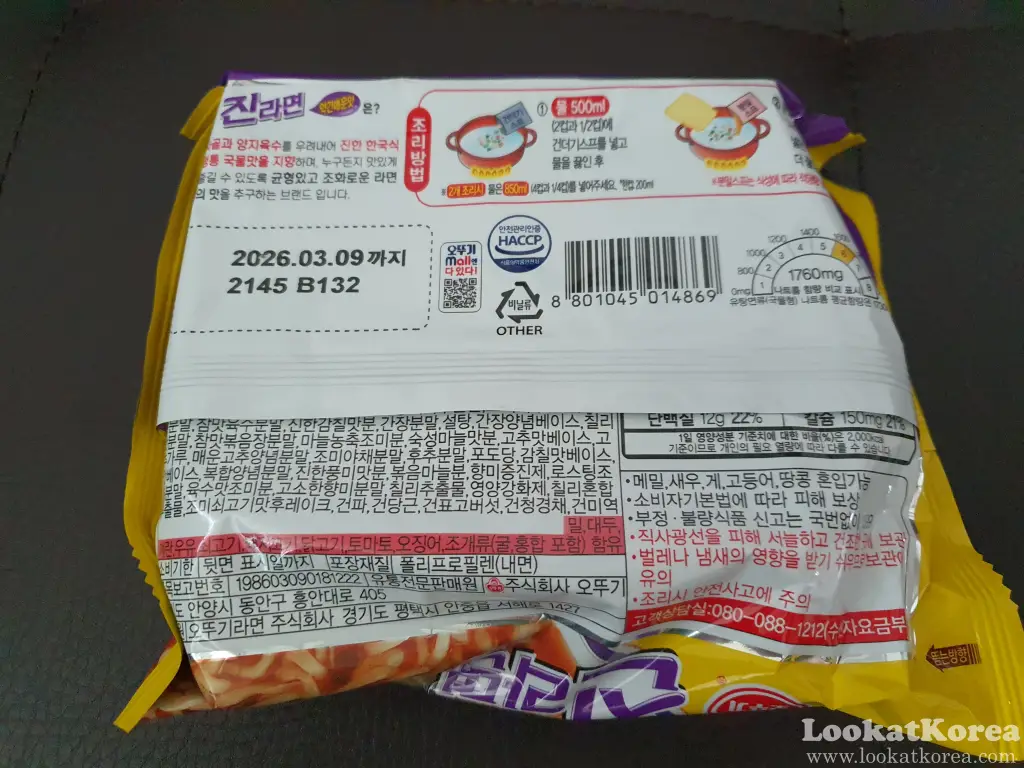 Ottogi’s choice of color for this new product is quite clever. By mixing the blue of the Mild version and the red of the Spicy version, they landed on a vibrant purple. Since purple isn’t a common color for ramen packaging in Korea, it immediately grabs your attention. Aside from the color, the classic design and reliable quality of the soup and flakes remain consistent with the Jin Ramen brand we know.