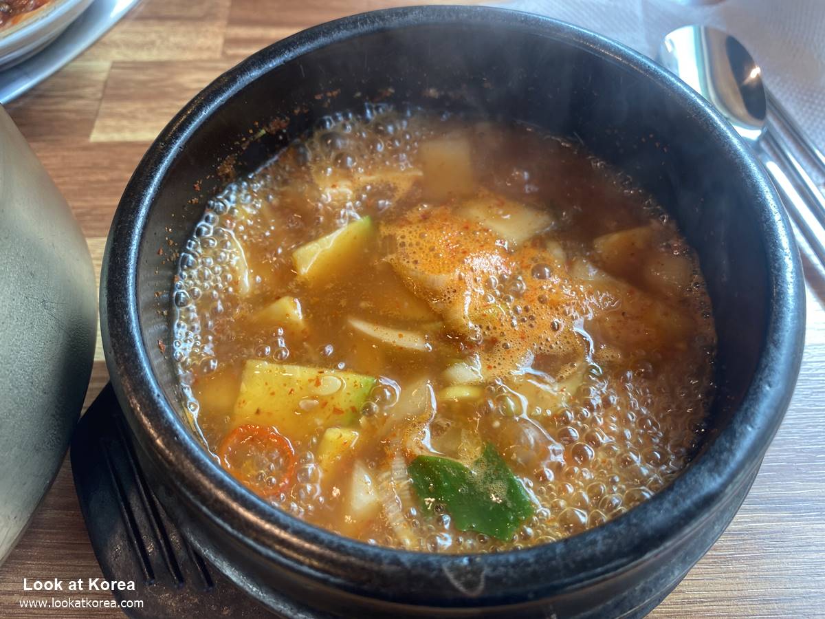 Soup or stew to eat with Yukhoe bibimbap is served.